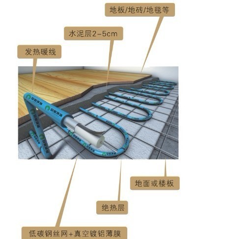 發熱電纜電地暖系統由發熱電纜和溫控器兩部分組成,發熱電纜鋪設于地面中,溫控器安裝于墻面上。當室內環境溫度或地面溫度低于溫控器設定的溫度時,溫控器接通電源,發熱電纜通電后開始發熱升溫,發出的熱量被覆蓋著的水泥層吸收,然后均勻地加熱室內空氣,還有一部分熱量以遠紅外輻射的方式直接釋放到室內。該種方式的采暖系統把整個地面作為散熱器,室內溫度上層低而下層高,有溫足而頂涼的感受,使您感到舒適而自然。